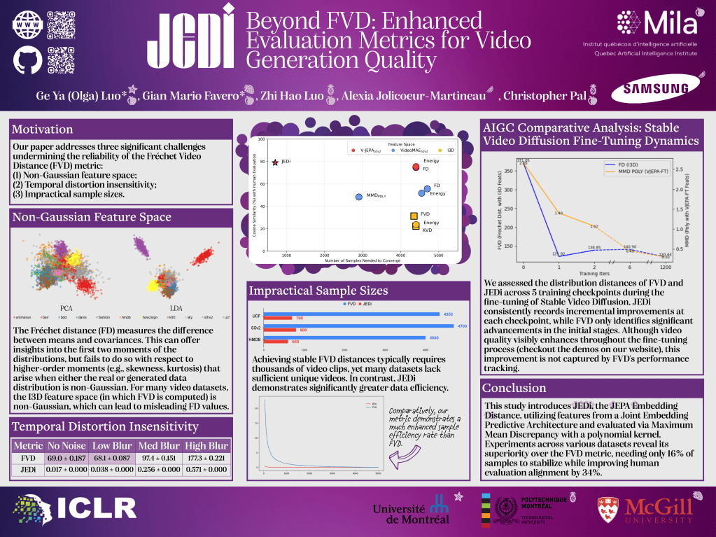 Abstract: The Fréchet Video Distance (FVD) is a widely adopted metric for evaluating video generation distribution quality. However, its effectiveness relies on critical assumptions. Our analysis reveals three significant limitations: (1) the non-Gaussianity of the Inflated 3D Convnet (I3D) feature space; (2) the insensitivity of I3D features to temporal distortions; (3) the impractical sample sizes required for reliable estimation. These findings undermine FVD’s reliability and show that FVD falls short as a standalone metric for video generation evaluation. After extensive analysis of a wide range of metrics and backbone architectures, we propose JEDi, the JEPA Embedding Distance, based on features derived from a Joint Embedding Predictive Architecture, measured using Maximum Mean Discrepancy with polynomial kernel. Our experiments on multiple open-source datasets show clear evidence that it is a superior alternative to the widely used FVD metric, requiring only 16% of the samples to reach its steady value, while increasing alignment with human evaluation by 34%, on average.